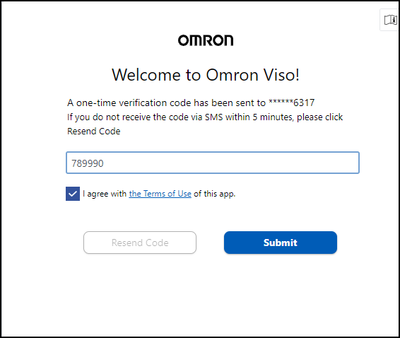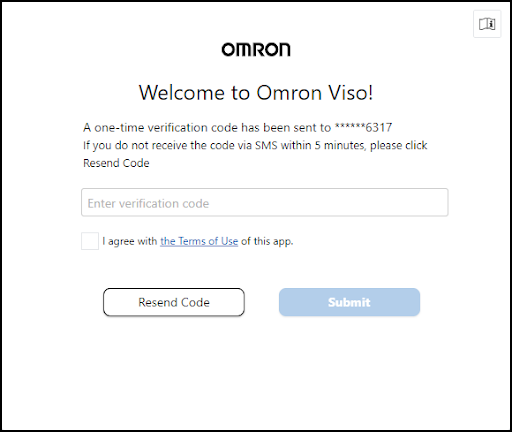 - If you did not receive a verification code by SMS, click [Resend Code]. If, after 5 minutes, you still have not received a verification code please contact OMRON Customer Service.